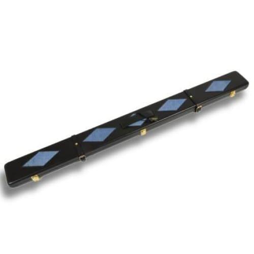 Black & Blue Patchwork pattern leather cue case. Peradon hand made leather cases are truly stunning cases. Whilst many alternative cases may look good in photographs these cases are skillfully constructed by hand down with attention right to the smallest detail. They are constructed as a wooden case which is then beautifully upholstered with the finest quality leather on the exterior and with suede leather on the padded interior which holds the cue in place. The smooth rounded leather case ends are testament to the skill of the case maker. The solid brass hinges and catches are of the highest quality as are the leather straps and buckles. The interior compartments of this case have been cleverly thought out to be much more versatile than most other cases, whilst keeping the length to a minimum. The case will hold a cue with a shaft length up to 47” and along with the butt section will hold additional extensions and butt end extensions. Alternatively the case can also be used to carry two cues without extensions. For details of the compartment sizes please see the chart below. We recommend that you measure the length of your cue including any protruding joints to ensure they will fit. If you are considering purchasing in conjunction with a cue offered by Peradon details of all cue shaft, butt and extension lengths can be found on this website. The exterior of the case is embossed with the distinctive Peradon trademark.