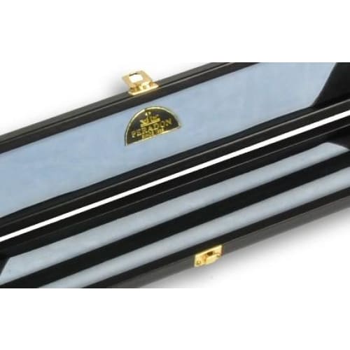 Black leather cue case. Peradon hand made leather cases are truly stunning cases. Whilst many alternative cases may look good in photographs these cases are skillfully constructed by hand down with attention right to the smallest detail. They are constructed as a wooden case which is then beautifully upholstered with the finest quality leather on the exterior and with sued leather on the padded interior which holds the cue in place. The smooth rounded leather case ends are a testament to the skill of the case maker. The solid brass hinges and catches are of the highest quality as are the leather straps and buckles. Although designed to hold a one-piece cue this case has two channels so the case will also hold any screw in extensions that may also be required (or even two cues). The exterior of the case is embossed with the distinctive Peradon trademark.